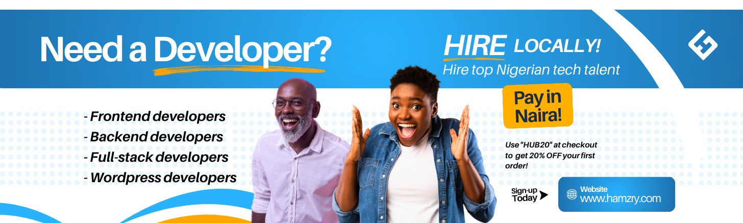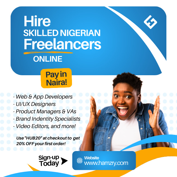 Whether you need a stunning website or eye-catching graphics, you can hire locally and pay in Naira with full peace of mind. Plus, enjoy 20% OFF your first order when you use the discount code "HUB20" at checkout.